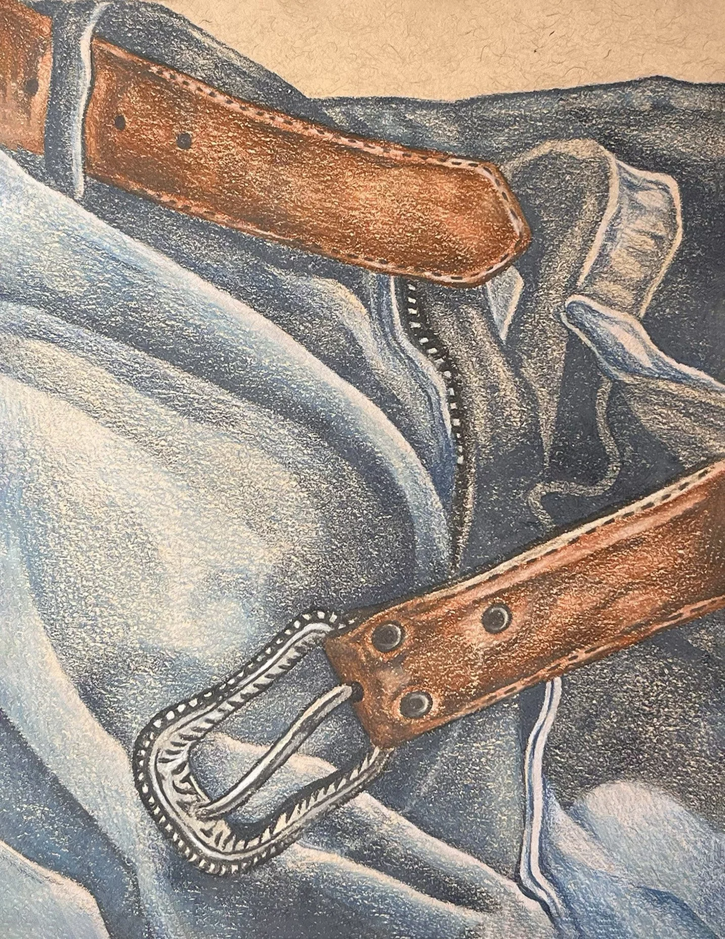 Recycled denim jeans, colored pencil, ballpoint pen
